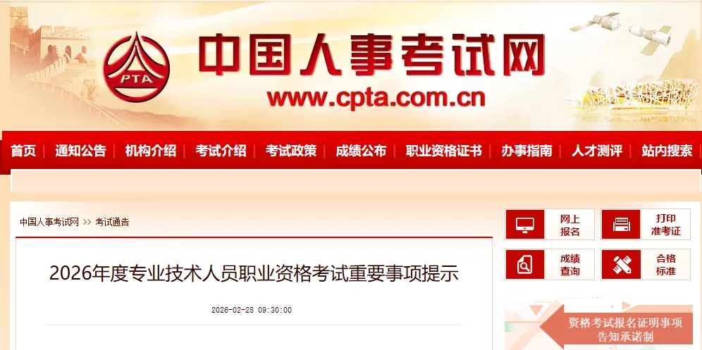 人事网发布:2026年度专业技术人员职业资格考试重要事项提示